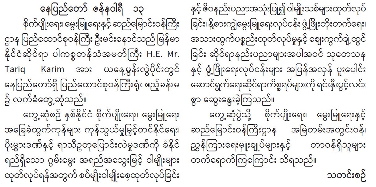 ပြည်ထောင်စုဝန်ကြီး ဦးမင်းနောင် ပါကစ္စတန်သံအမတ်ကြီးအား လက်ခံတွေ့ဆုံ